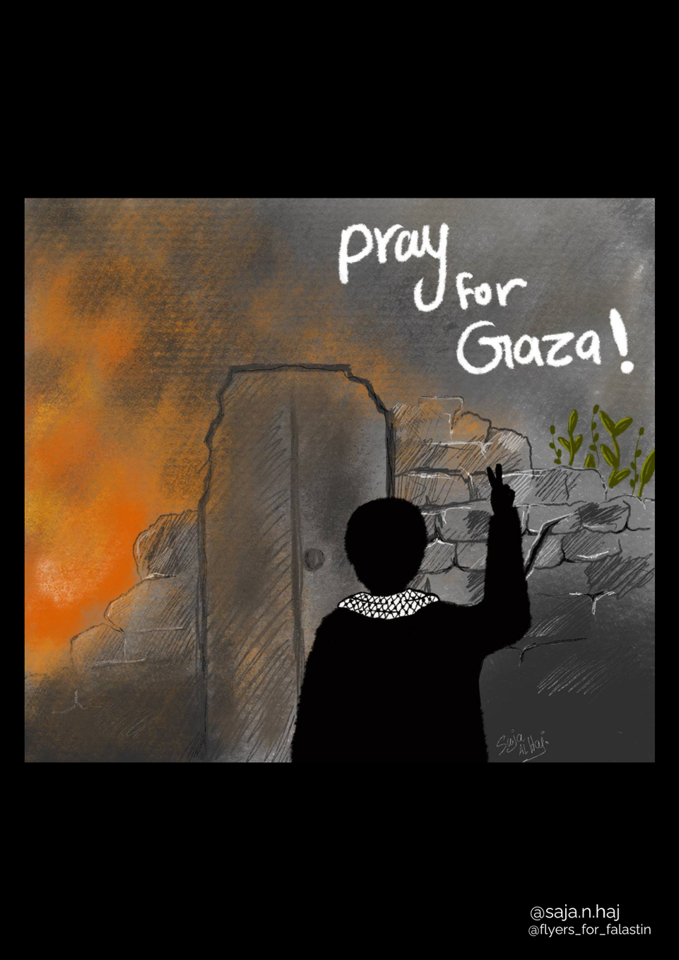 Destroyed buildings, Fire, Keffiyeh, Olives, Peace sign